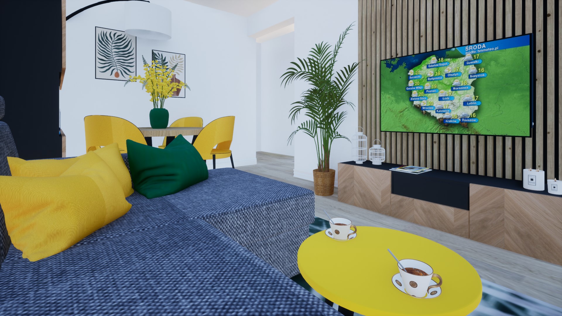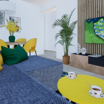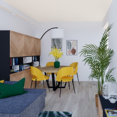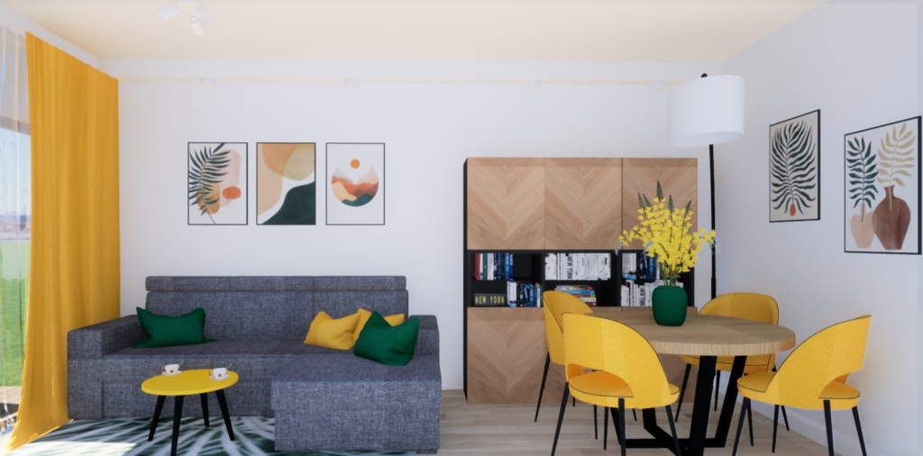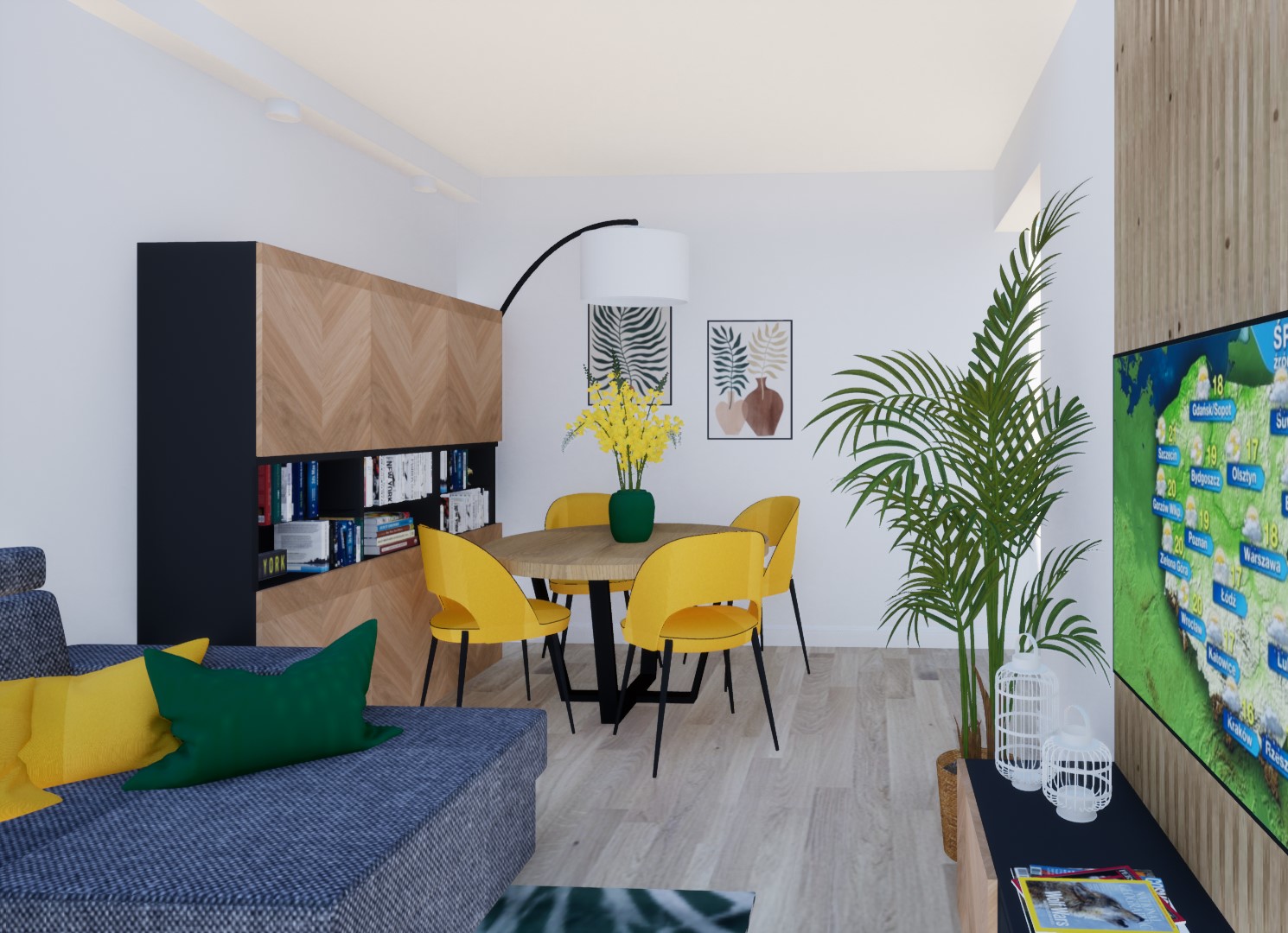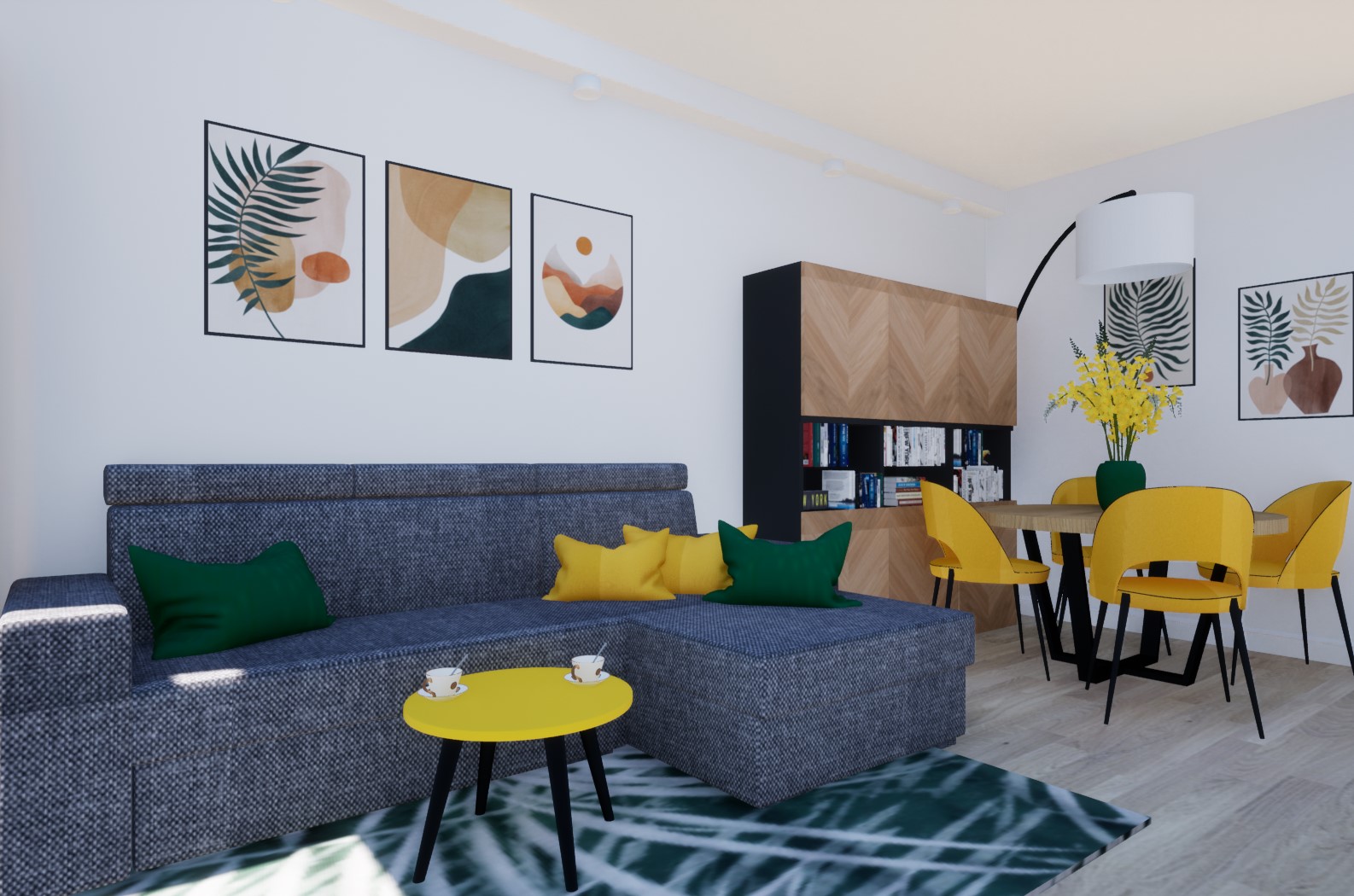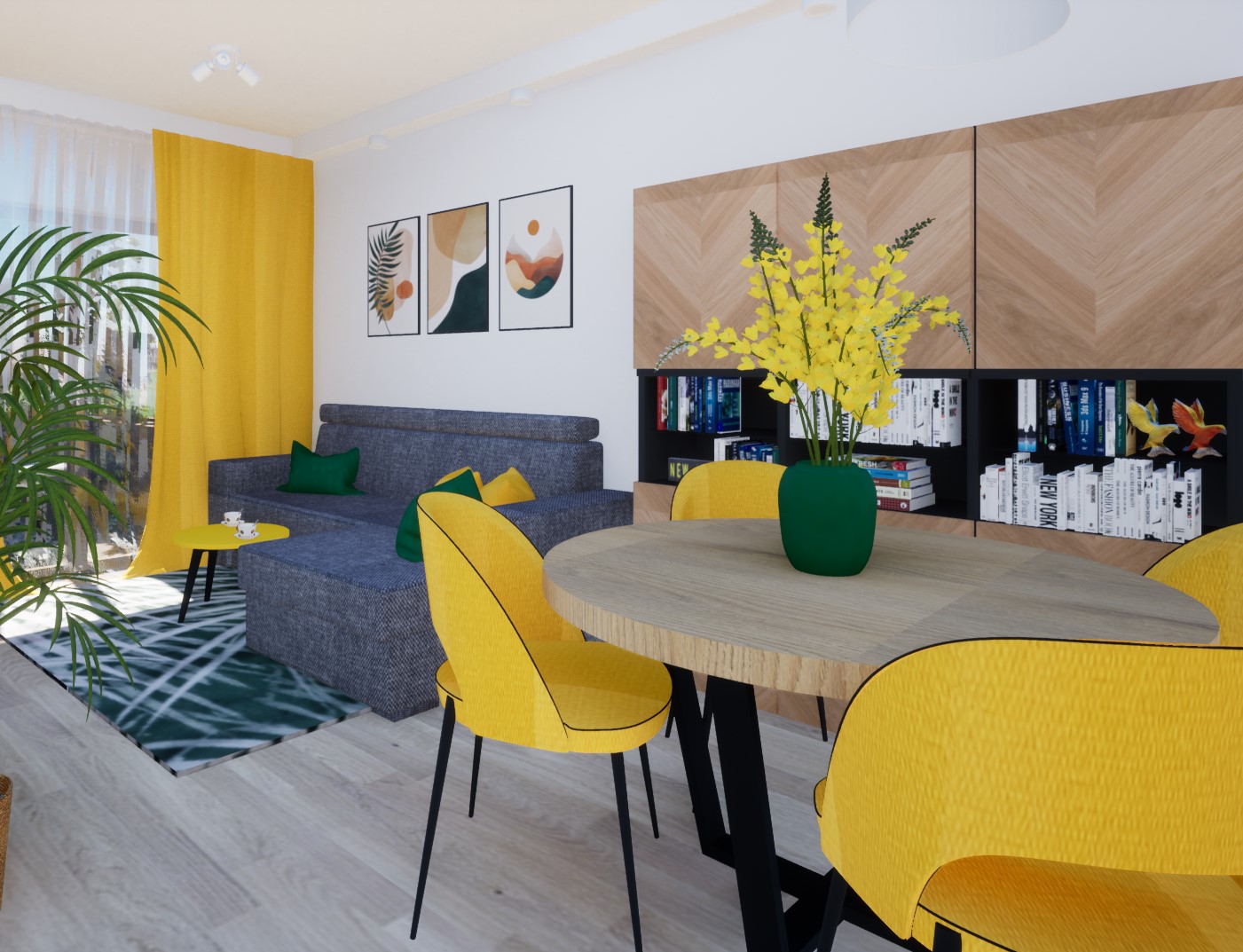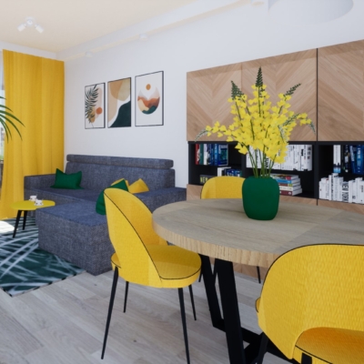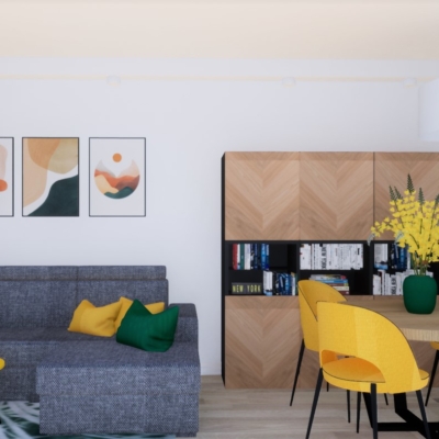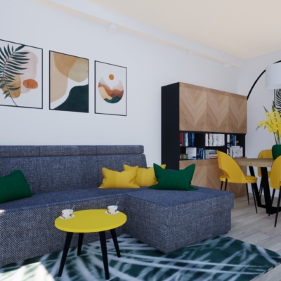 Najbardziej kolorowy salon jaki wykonywaliśmy. Niezwykle słoneczny, optymistyczny i pogodny dla Inwestorów, którzy uwielbiają kolory! Założeniem projektowym było stworzenie przestrzeni z wydzieloną częścią jadalnianą oraz wypoczynkową. Podstawa salonu jest neutralna jednak za pomocą wymiany kilku elementów wyposażenia możemy zmienić ta przestrzeń na salon o dowolnym kolorze. Kilka zmian (zasłony, plakaty krzesła, stolik kawowy) i możemy stworzyć BLUE salon lub GREEN salon… Miłej zabawy kolorami!