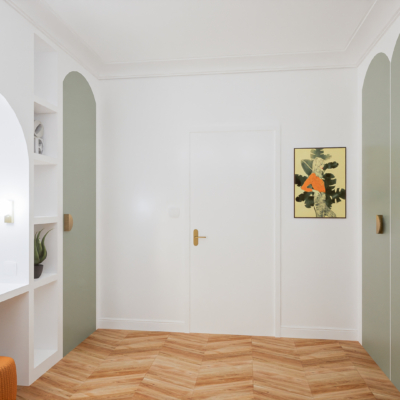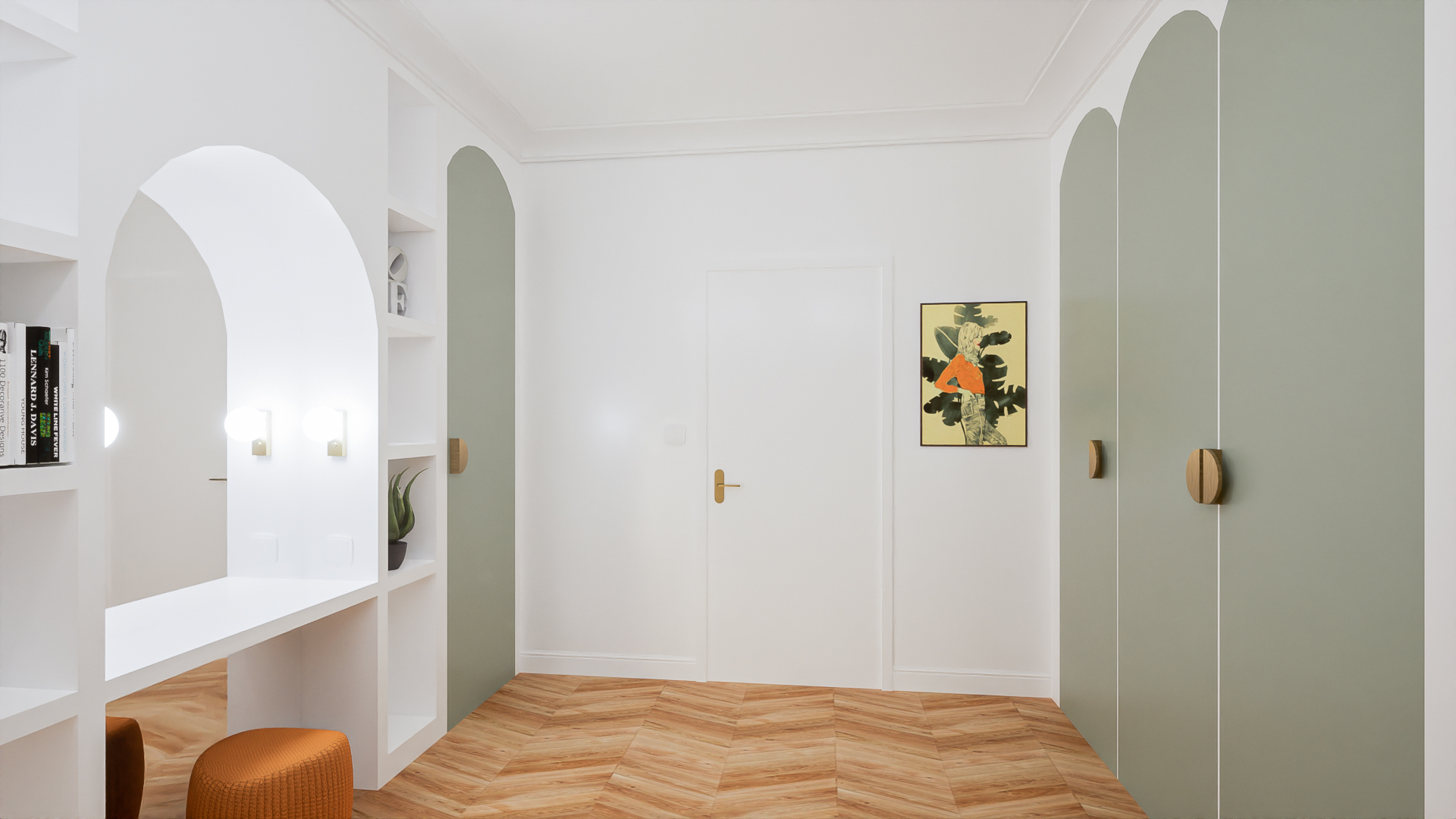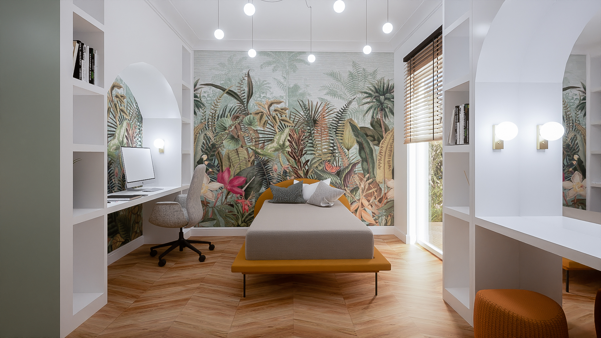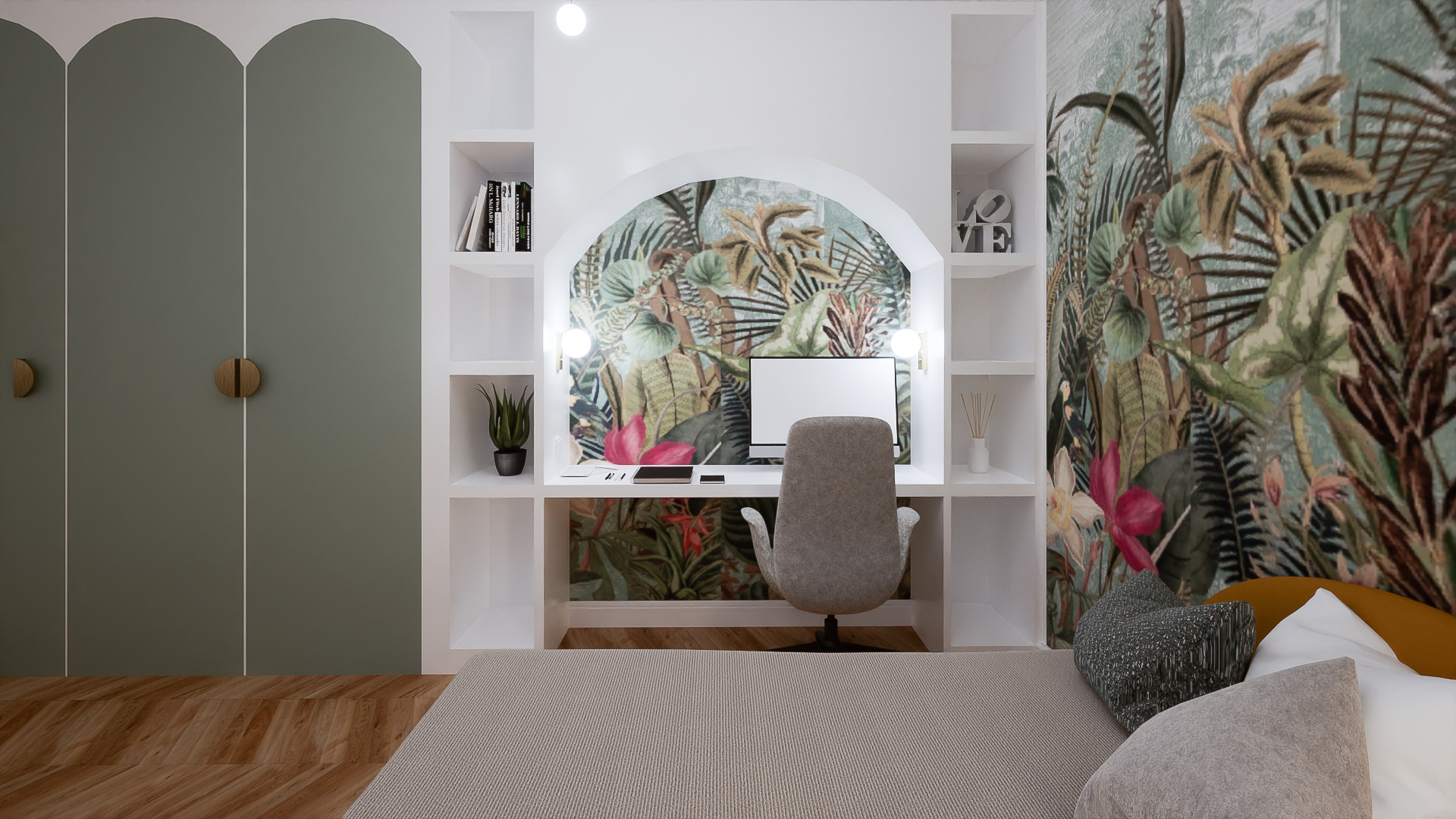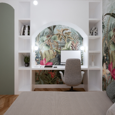 Różne odcienie zieleni zostały przełamane łóżkiem w kolorze ochry. Zabudowa meblowa: biurko, toaletka oraz szafy zwieńczone pięknymi łukami, które złagodziły nieco całość i nadały tej aranżacji delikatności. Nie zabrakło też „biżuterii pokoju” czyli zjawiskowej, dużej lampy oraz kinkietów! Projekt godny każdej nastolatki.