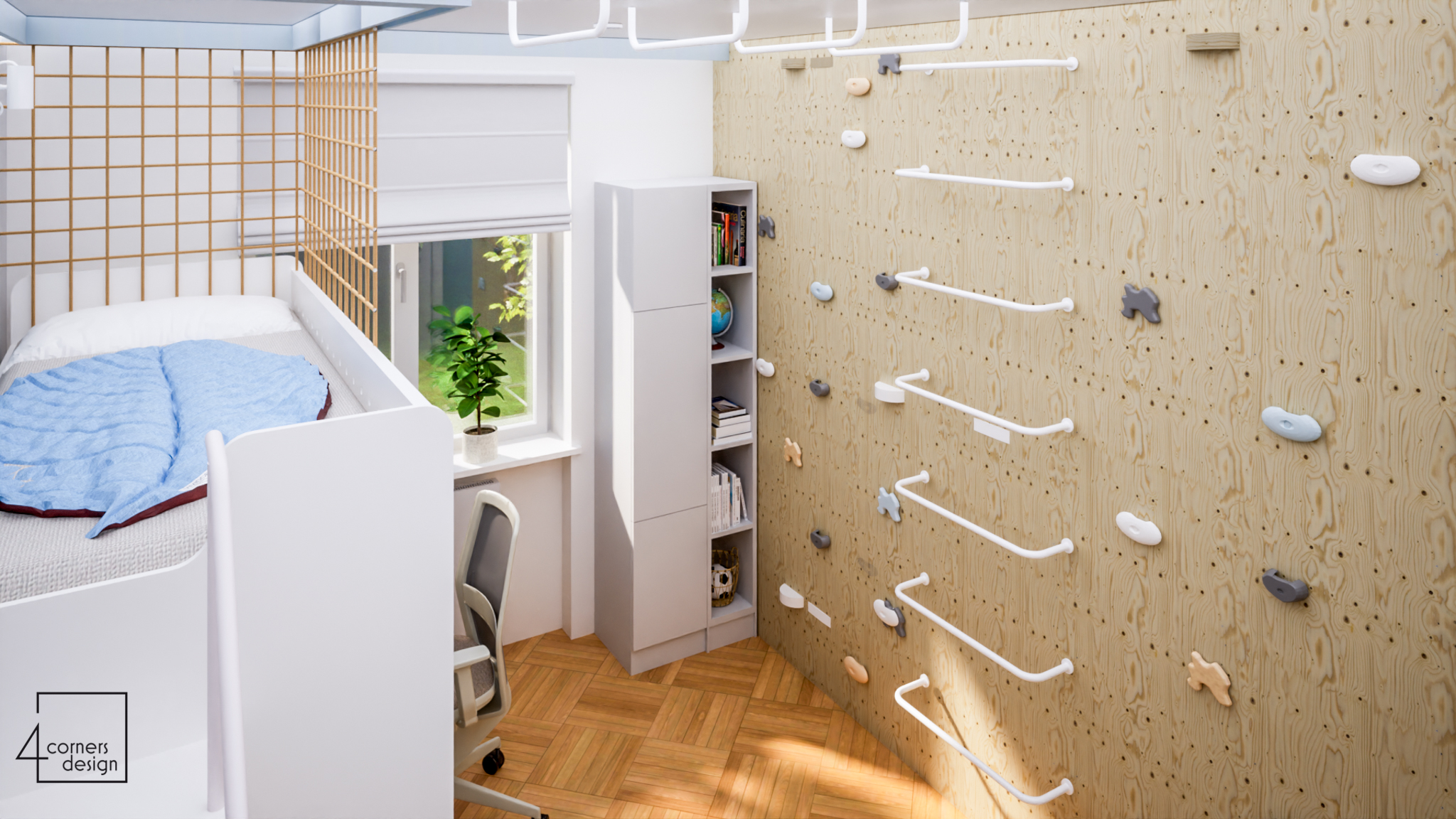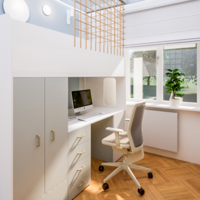 Miała być kratka na ścianie i jest. Miał być kolor niebieski, jest. Miała być ścianka wspinaczkowa na całej ścianie i uchwyty na suficie… są. To jeden z tych projektów, w którym mieliśmy jasno sprecyzowane oczekiwania i marzenia chłopca. Oczywiście, oprócz marzeń dziecka pokój musi spełniać swoje funkcje, dlatego poza strefą dobrej zabawy zadbaliśmy też o strefę nauki i odpoczynku. Całość uzupełniają plakaty z planetami zgodnie z zainteresowaniami chłopca i kinkiety przypominające księżyc w pełni. Lubimy spełniać marzenia dzieci!