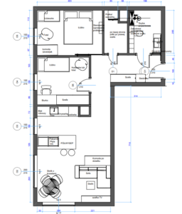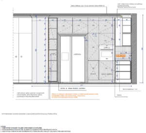 - Rozwinięcia wszystkich czterech ścian (dla każdego pomieszczenia co najmniej 4 rysunki określające montaż dekoracji ściennych (lameli, sztukaterii, obrzów kinkietów oraz innych elementów dekoracyjnych), płytek ściennych, rozrys rozmieszczenia mebli.