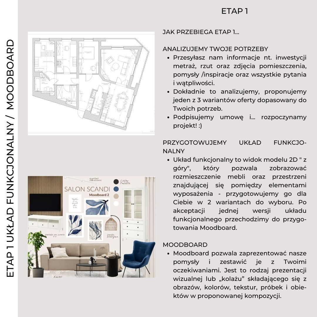 Często przed rozpoczęciem projektu, Inwestor ma w głowie „jakąś wizję”, wybrane zdjęcia, inspiracje…ale nie wie jak to wszystko połączyć. Są też Inwestorzy, którzy nie mają pomysłu na swoją wymarzoną przestrzeń. Nie ma w tym nic złego…uwielbiamy przygotowywać moodboardy.